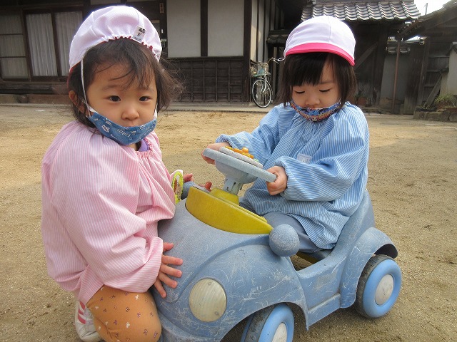 境内にある自転車などで楽しそうに遊んでいるね。