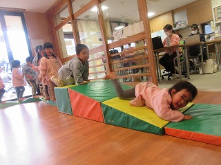 室内のアスレチック遊びをする年少・2歳児の花2組さん